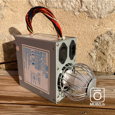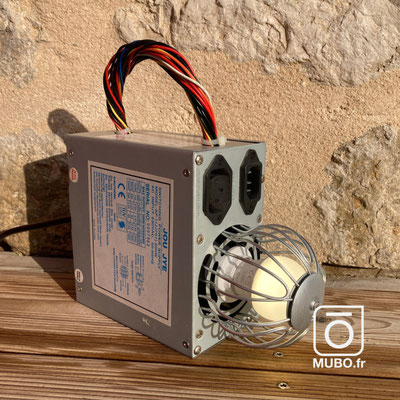 Lampe Allan création sur commande / carte blanche à MUBō Lampe 100% recycling Quand une crapaudine de gouttière croise des éléments informatiques, ils s'accordent pour devenir une lampe high-tech.