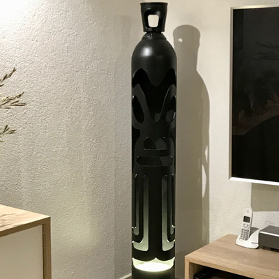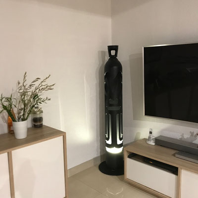 Lampe monumentale d'inspiration polynésienne réalisée à partir d'une bouteille d'oxygène.