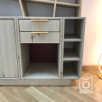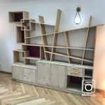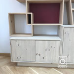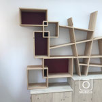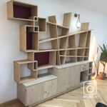 En réponse à une demande d'agencement de meuble avec espaces de rangement cachés et ouverts. Avec pour mots clés "déstructuré et asymétrique".