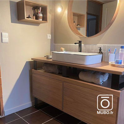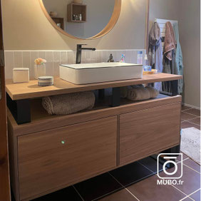 En réponse à une demande de création de meuble de salle de bain avec les mots clés : aérien, graphique, en bois sombre et moderne.
