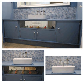 En réponse à une demande de création de meuble de salle de bain avec les mots clés : graphique, tout en 1, accordé aux tonalités de la pièce.