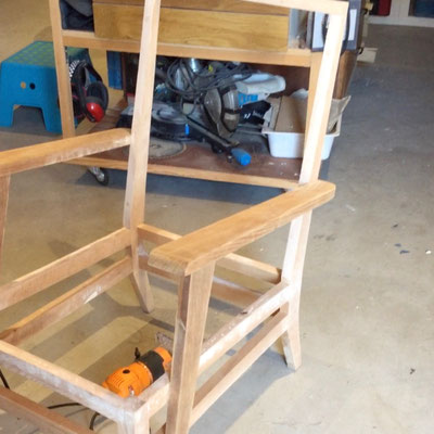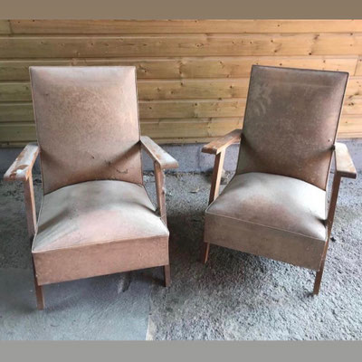 Anciens fauteuils de salon en bois de hêtre, résolument et durablement reconvertis au farniente ! Les compagnons inséparables des pauses causeries, lectures, rêveries, tout en douceur.